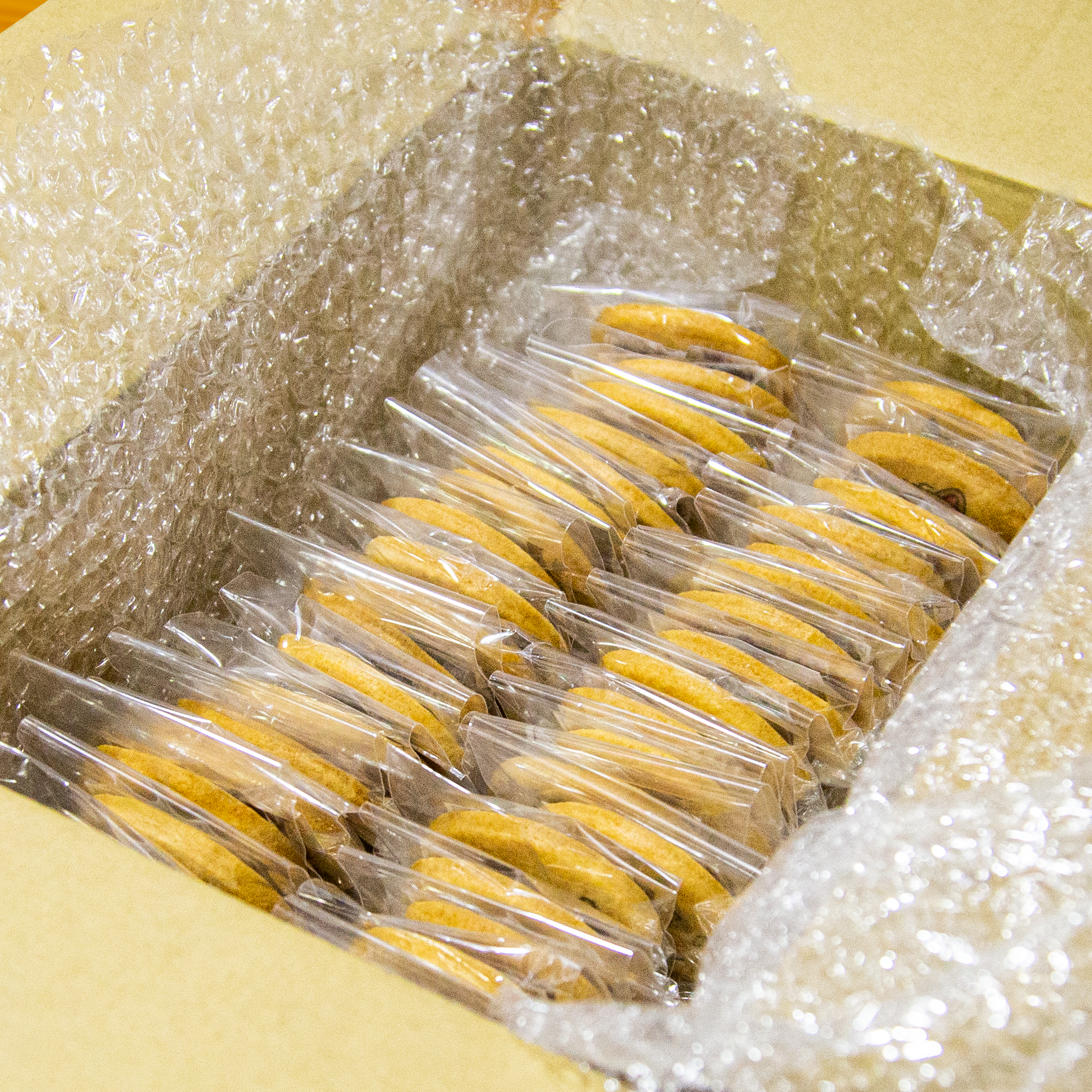ご依頼いただいた数量のマイクッキーを個包装のまま、大きな段ボールに入れて納品いたします。 個包装のまま使用する場合や、自社で用意した化粧箱や帯紙でコストを抑えた商品を作ったり、使い方は自由。 |