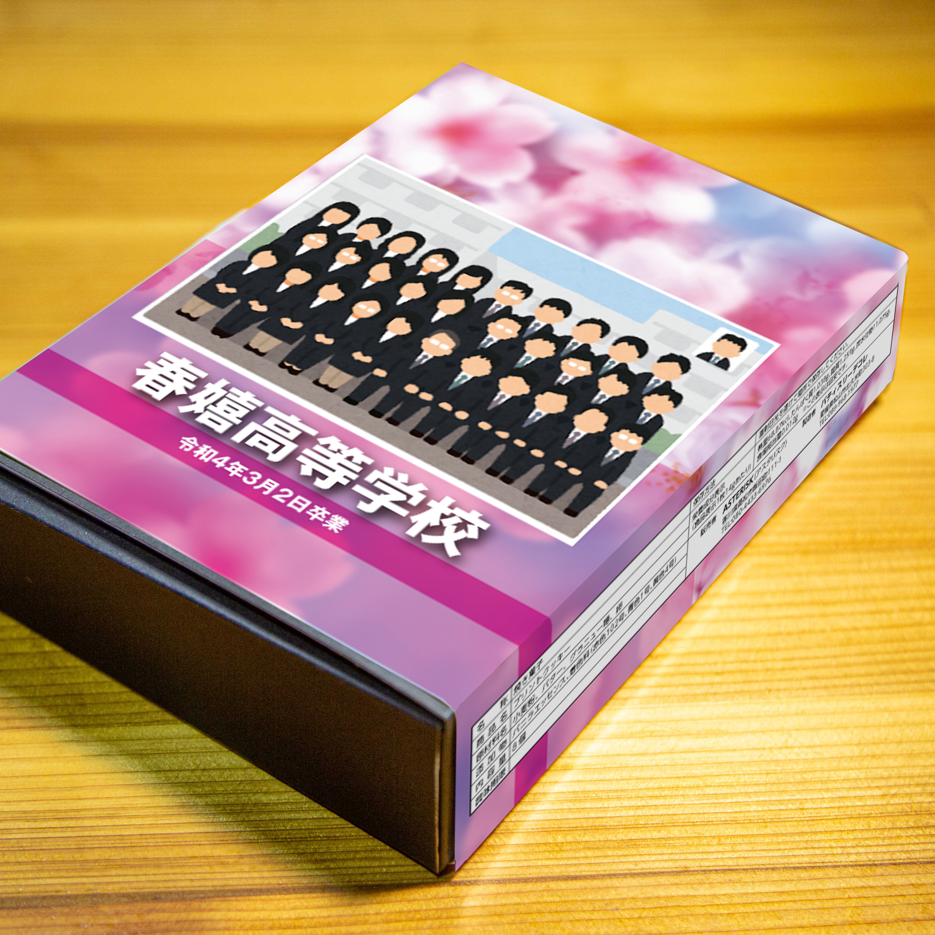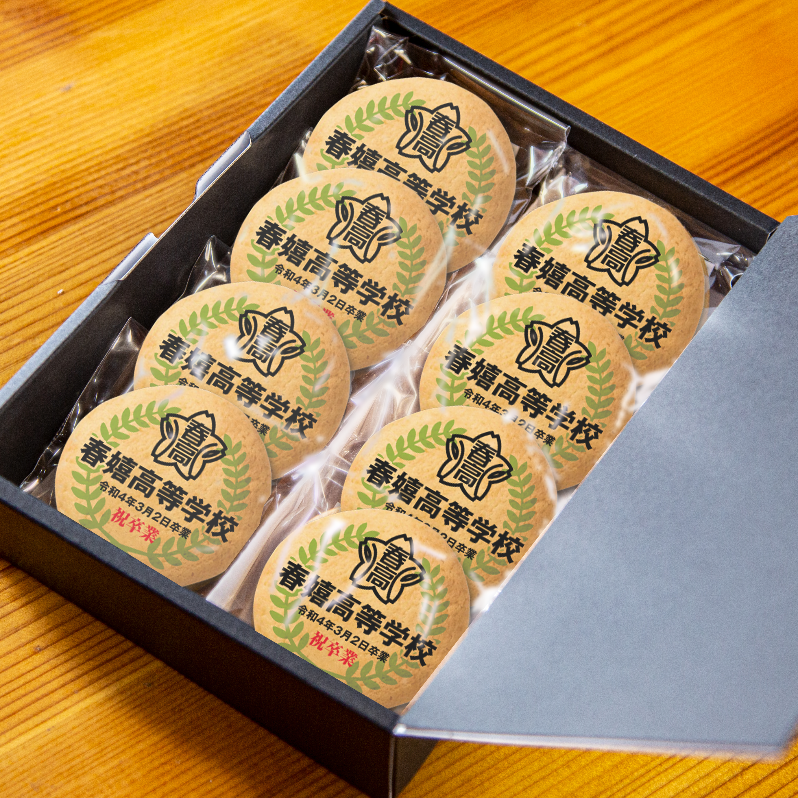 パッケージには集合写真、クッキーは校章と学校名そして祝卒業の文字。